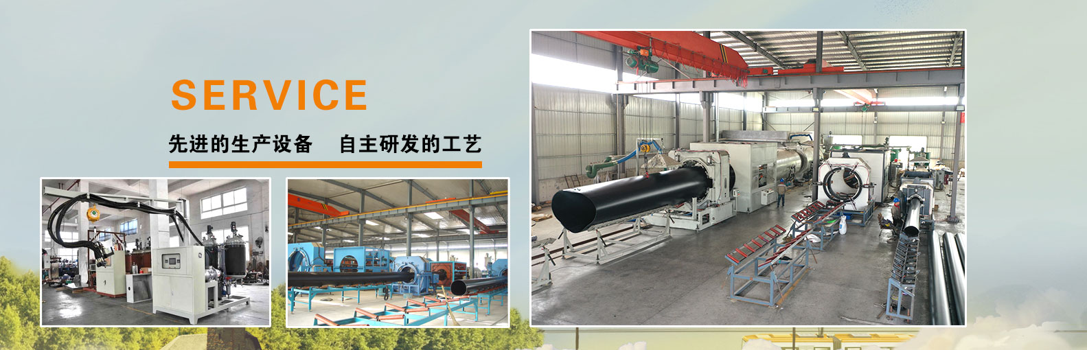 與之相配套的穿管設(shè)備和發(fā)泡平臺(tái),年產(chǎn)DN50-DN1600 保溫管道15萬(wàn)公里,保溫管件3萬(wàn)件;拋丸機(jī)2臺(tái)、電暈設(shè)備4臺(tái)、電熱熔套袖生產(chǎn)設(shè)備3臺(tái)。做到了自動(dòng)化,模具化,現(xiàn)代化生產(chǎn)
